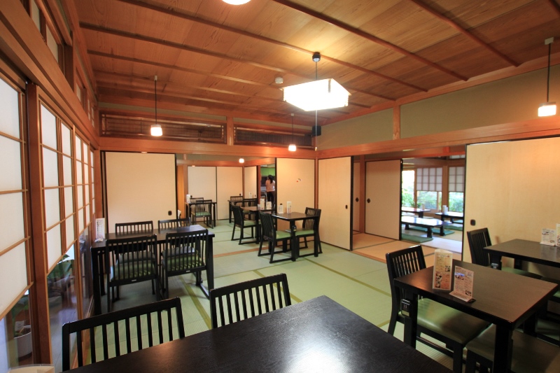 縁側から庭木の眺めを楽しむことができる、落ち着いた店内。