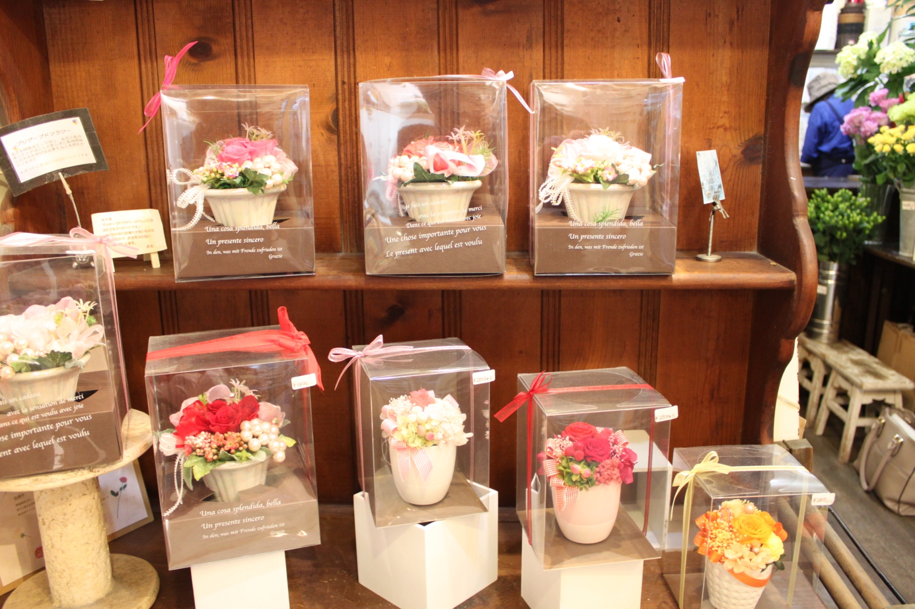 生花だけでなく、ギフト用のアレンジメントも種類豊富に揃っているのは嬉しいですね。