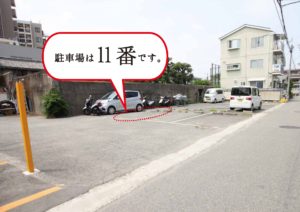 駐車場は、「北桜塚2丁目」の交差点を曲がったところにございます。「11番」に駐車下さい。